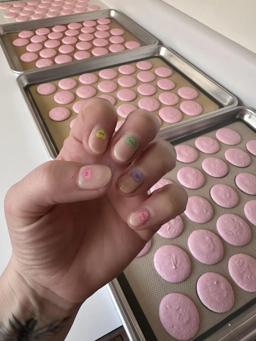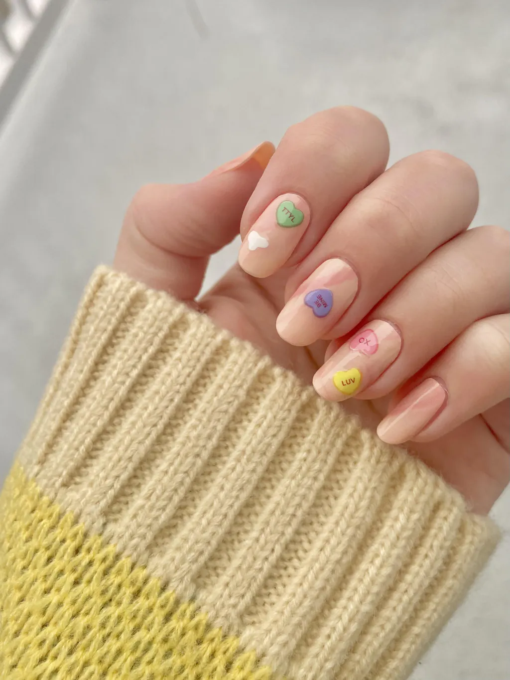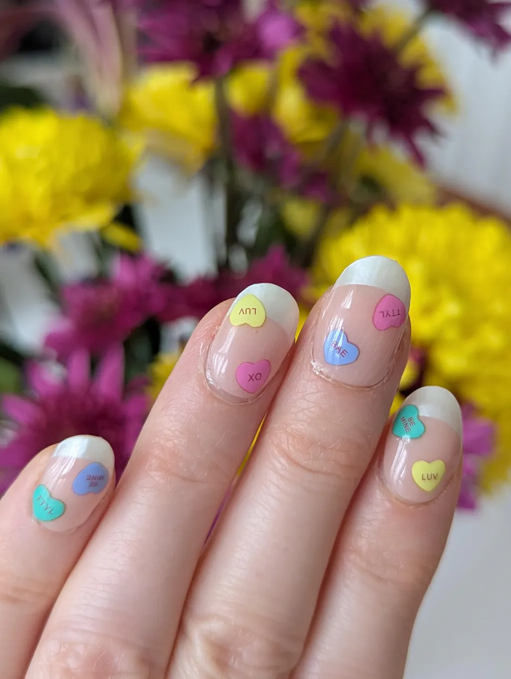 Applied the candy hearts from "Be Mine" on pearly French tip style semi-cured gel nails from Heyhae, and I love the combo! The gel top coat also works perfectly with the Deco stickers.