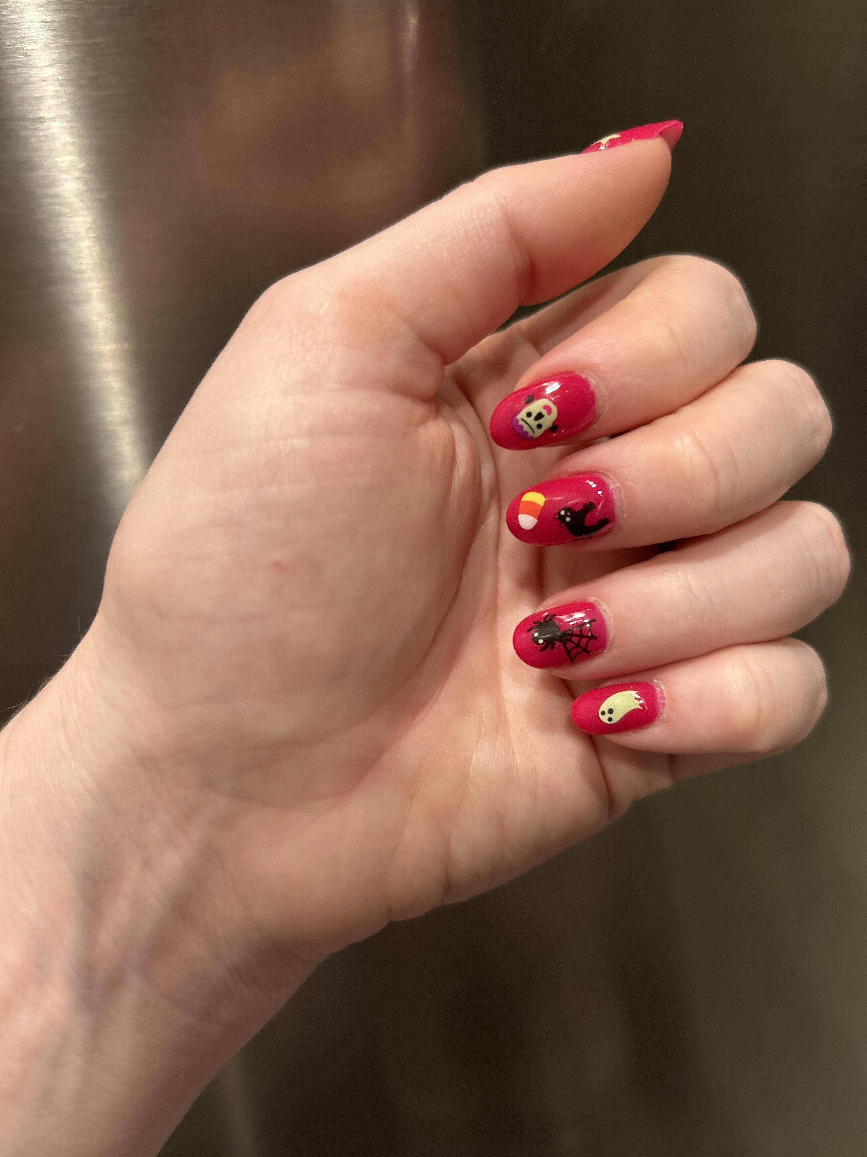 I am obsessed with the Boo Crew sheet! The mix of stickers is great and I absolutely love the dogs in costumes! It was really fun to mix and match these for my Halloween mani. The glow in the dark worked great on the candy stickers, not as great on the spiders since the eyes are so small, but they totally work. Another great sheet!