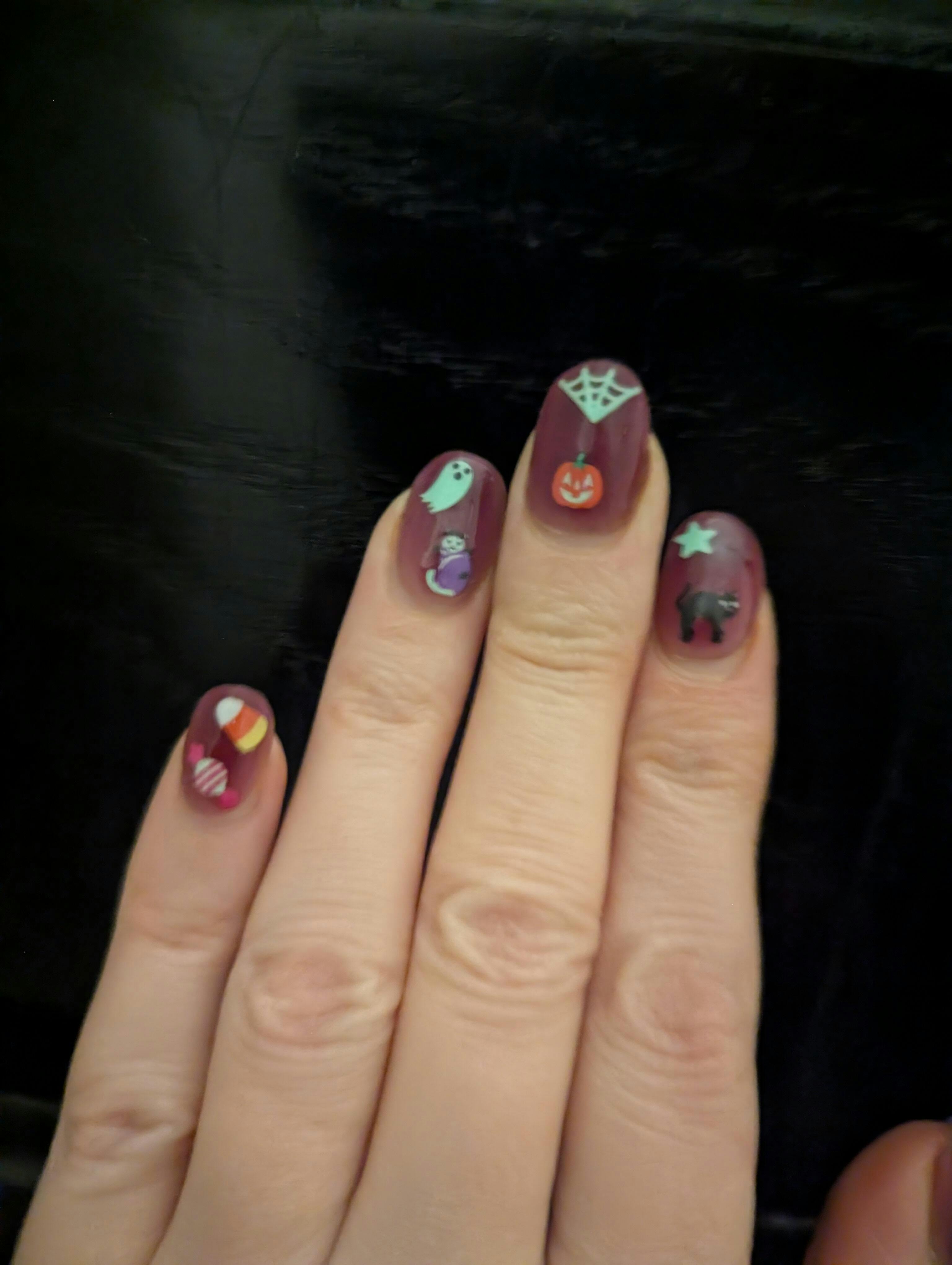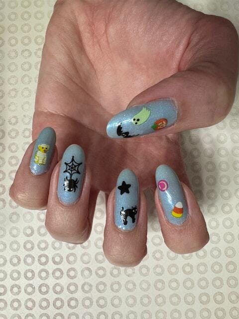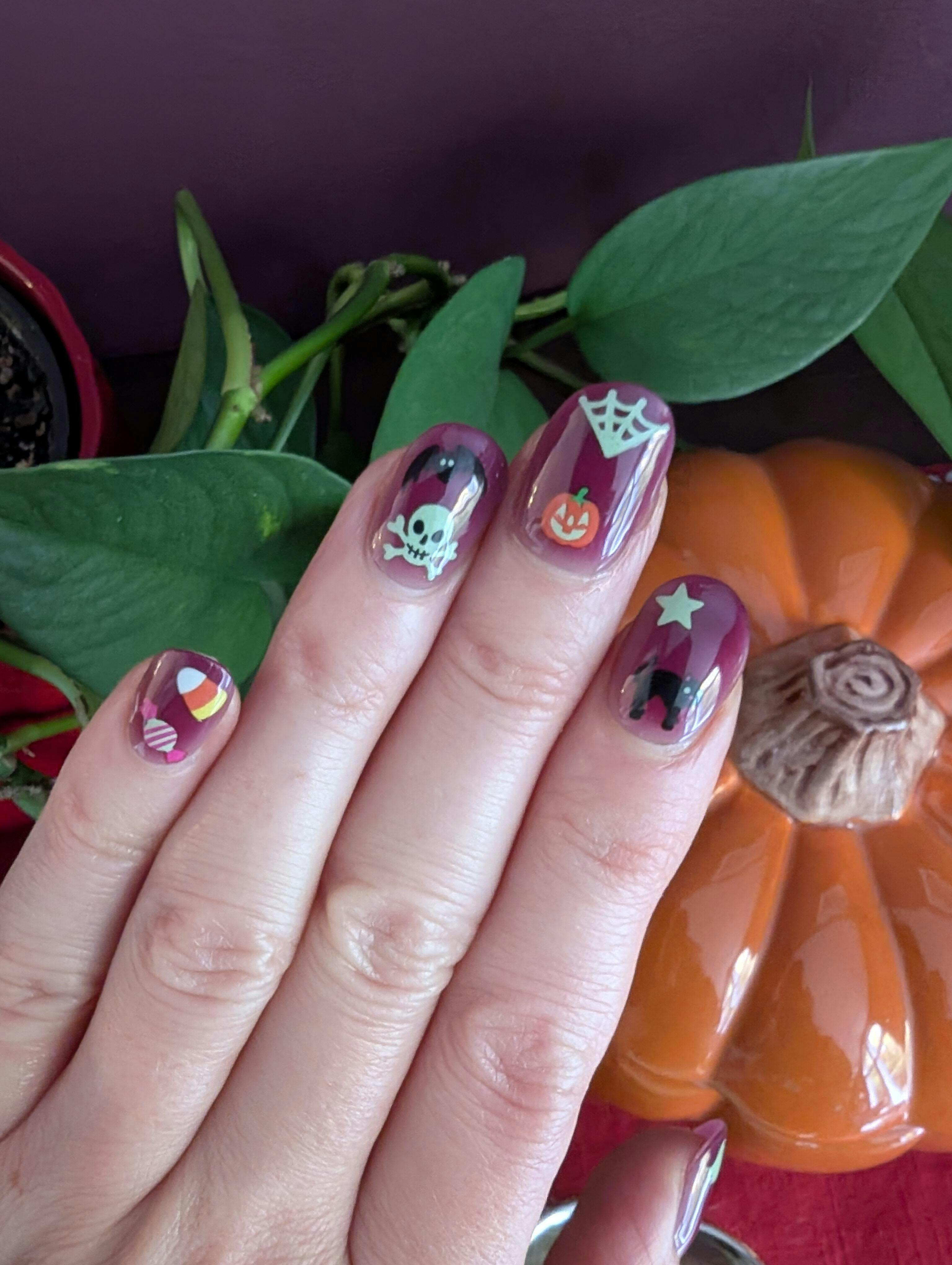 Your nostalgic Halloween in sticker form β but make it glow in the dark. Pumpkins, ghosts, and other cuties bring a sweet (and spooky) vibe to your nails. ππ»