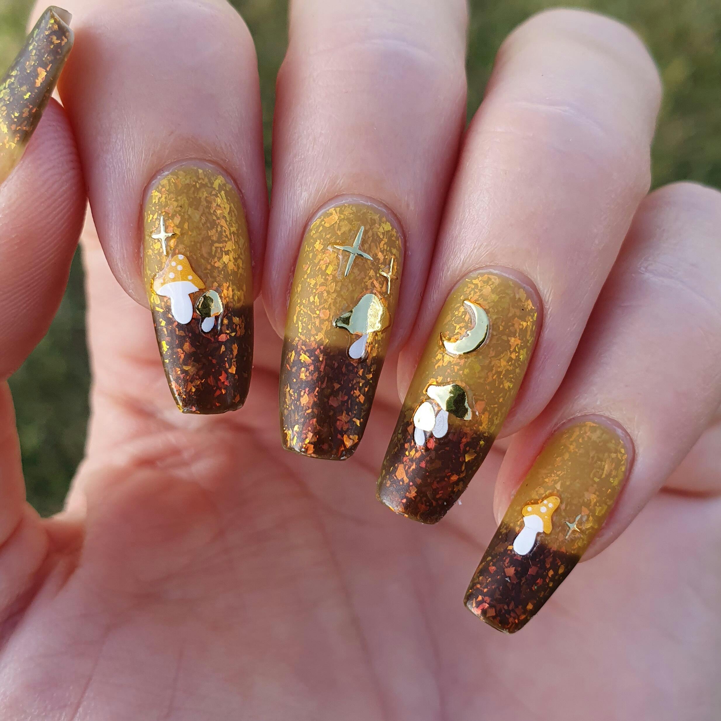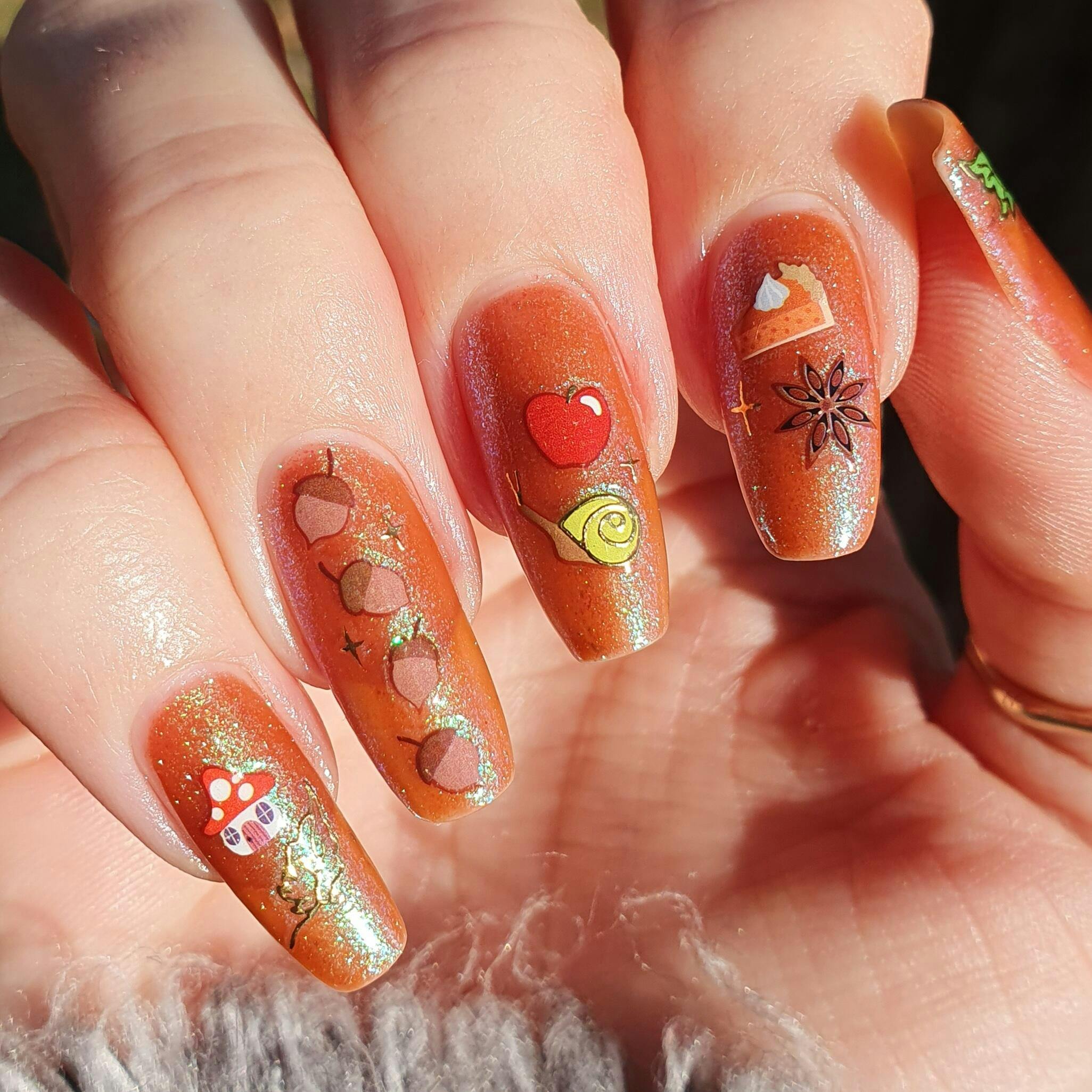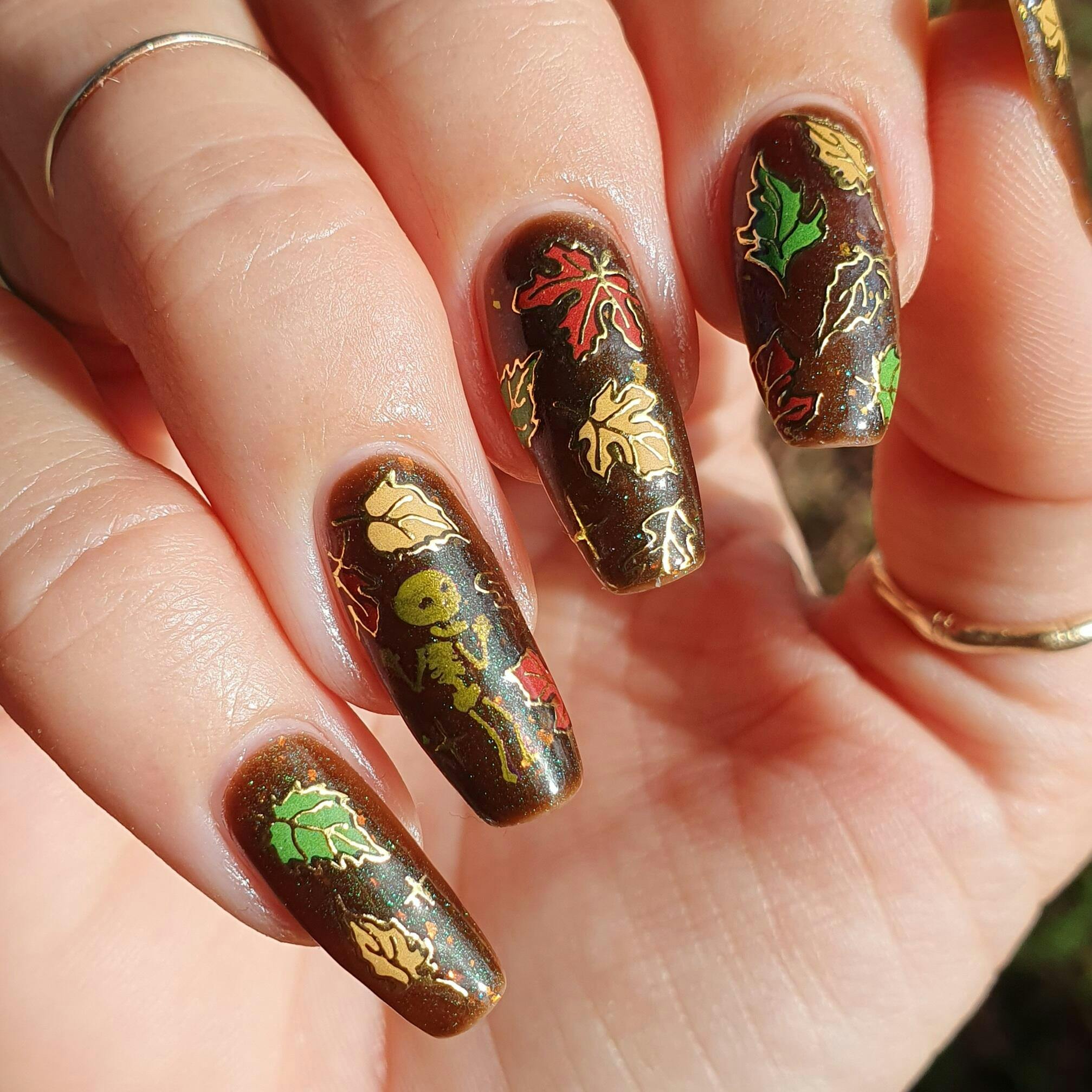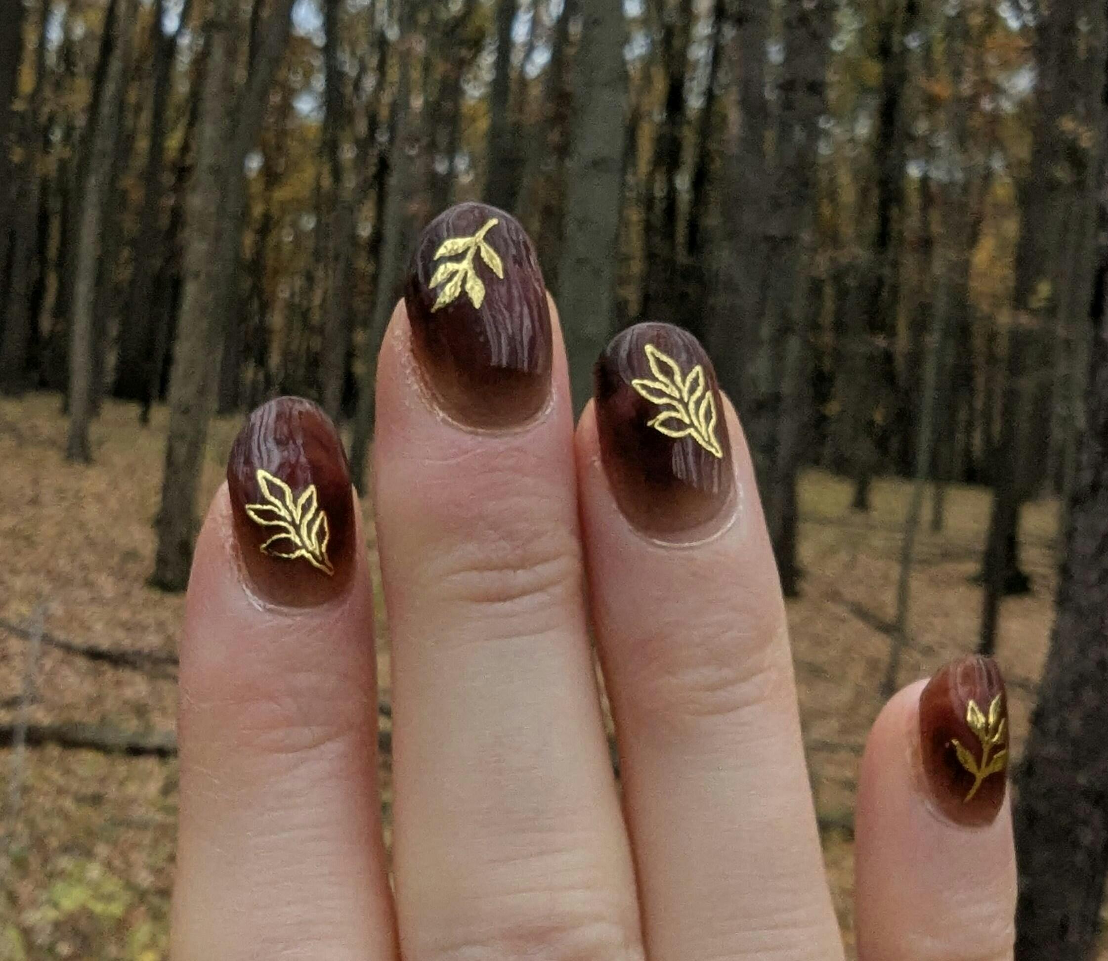 I love this Cozy stickers set! Used the gold leaves on Coffee Run brown nails for gorgeous autumn nails. 🍂 This is the second set of nails that I've used the Cozy stickers on. I would love a set that has more gold leaves because I would use more year-round! ✨