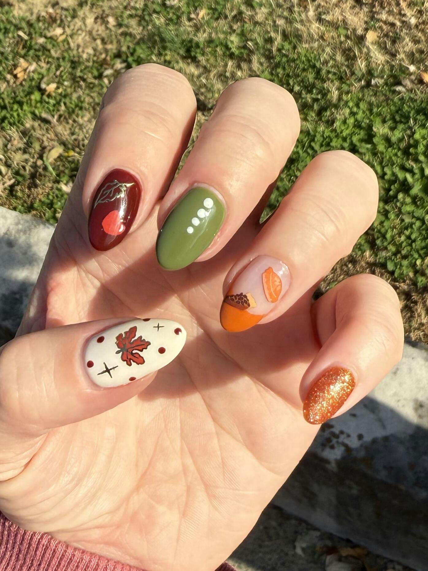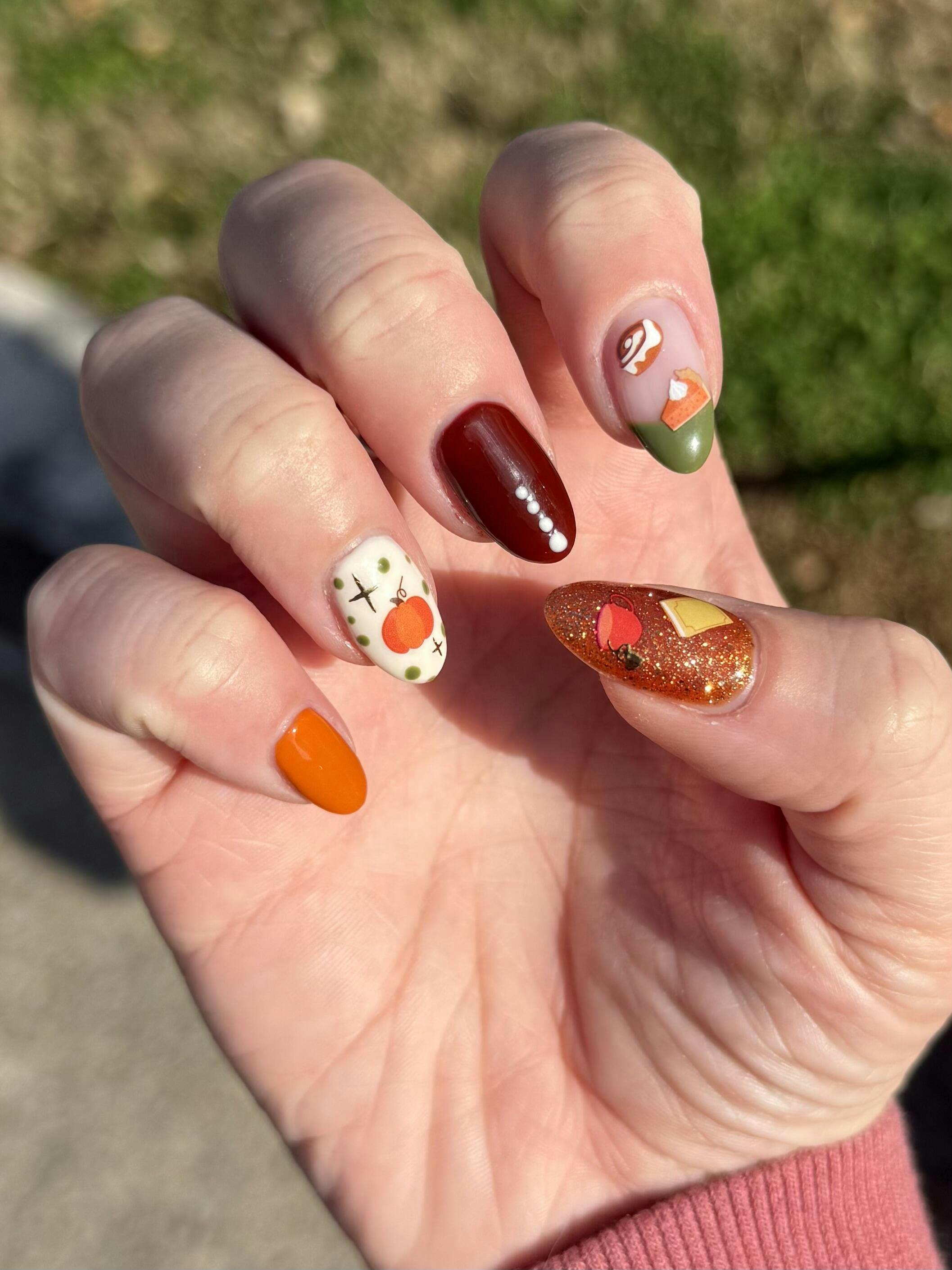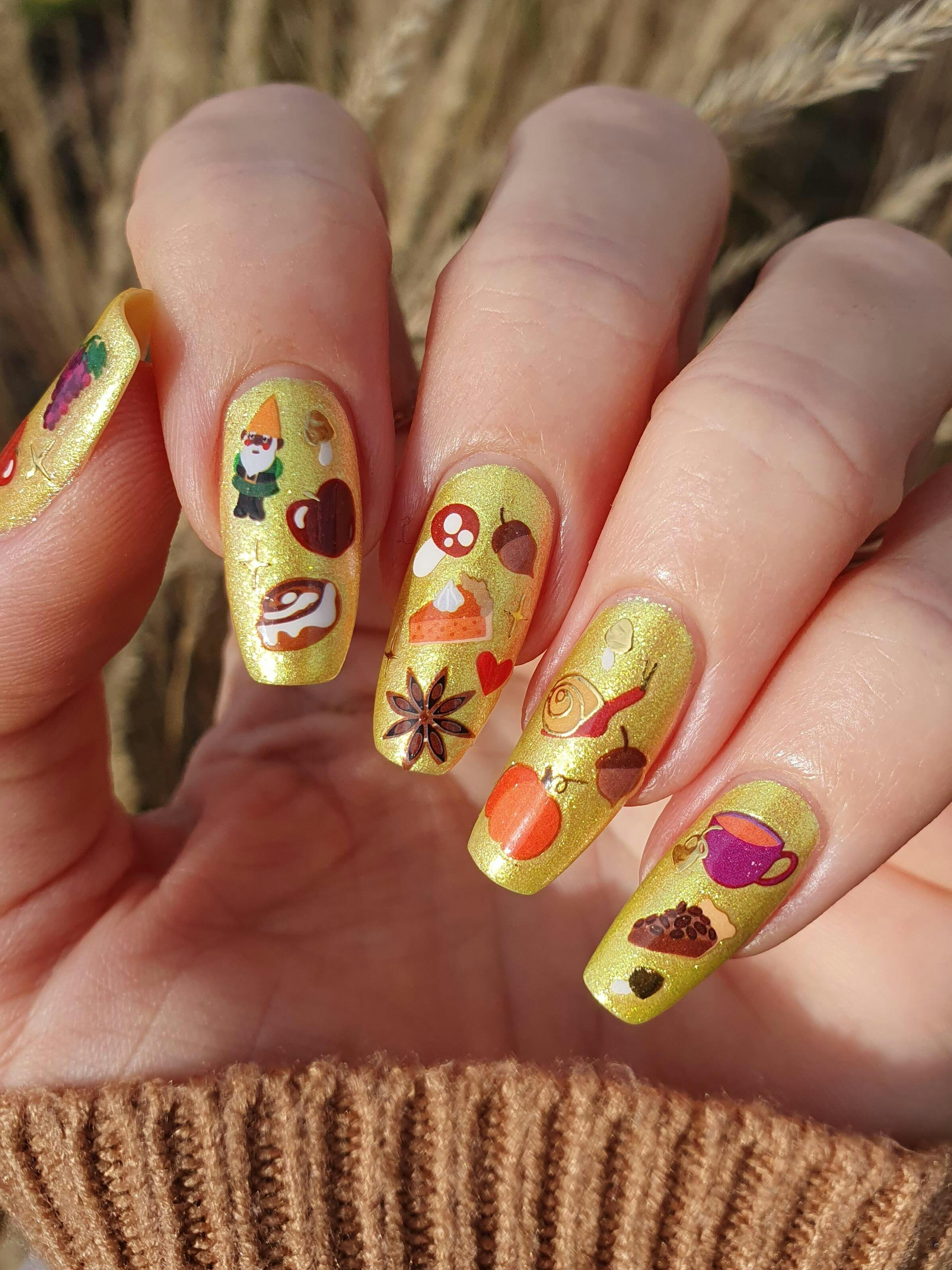 I used the leaves, books, coffee cups, cinnamon rolls, sparkles, and gnome ("Pierpont," lol) stickers from Cozy as part of Gilmore Girls themed nails for an event!