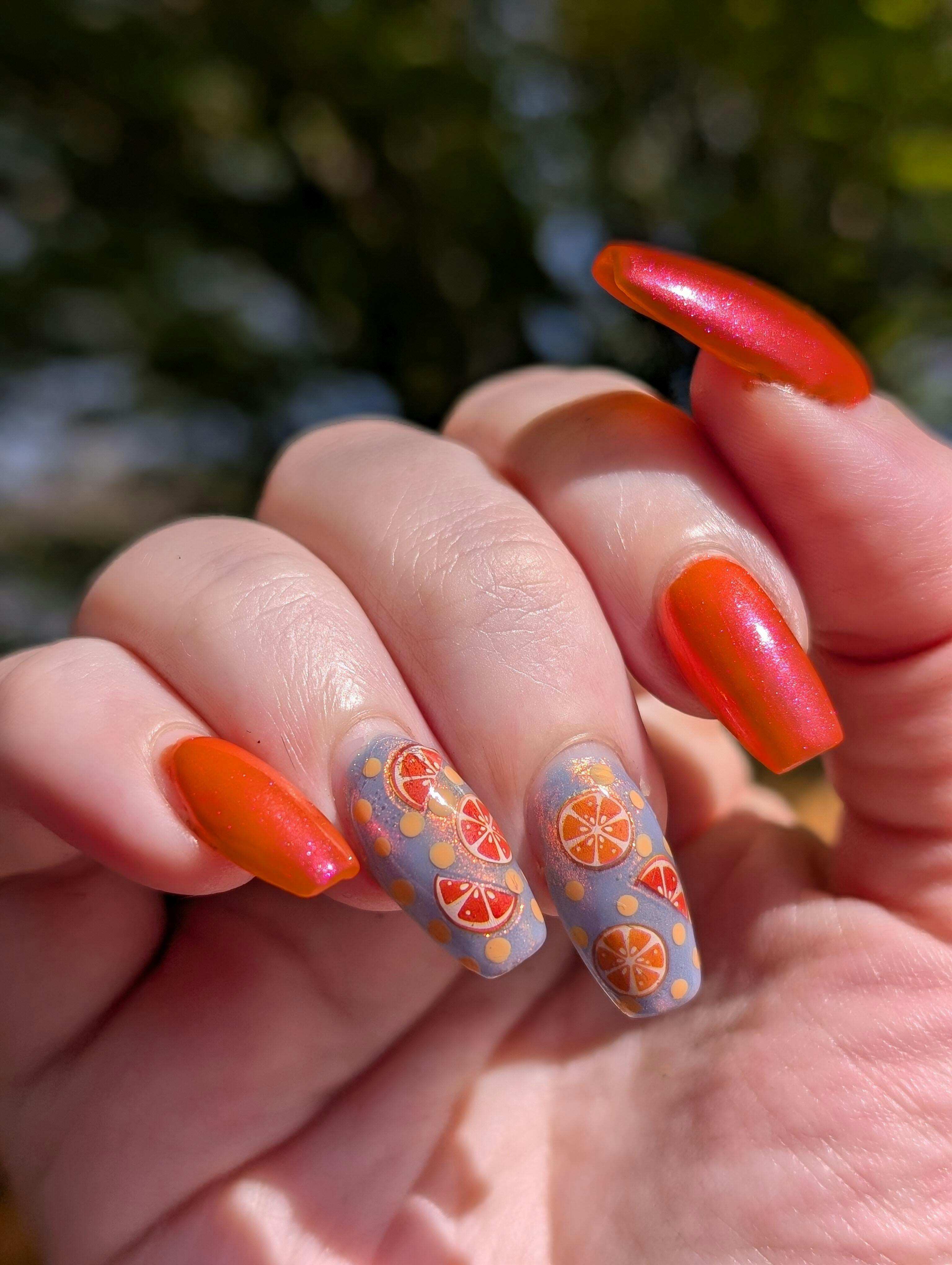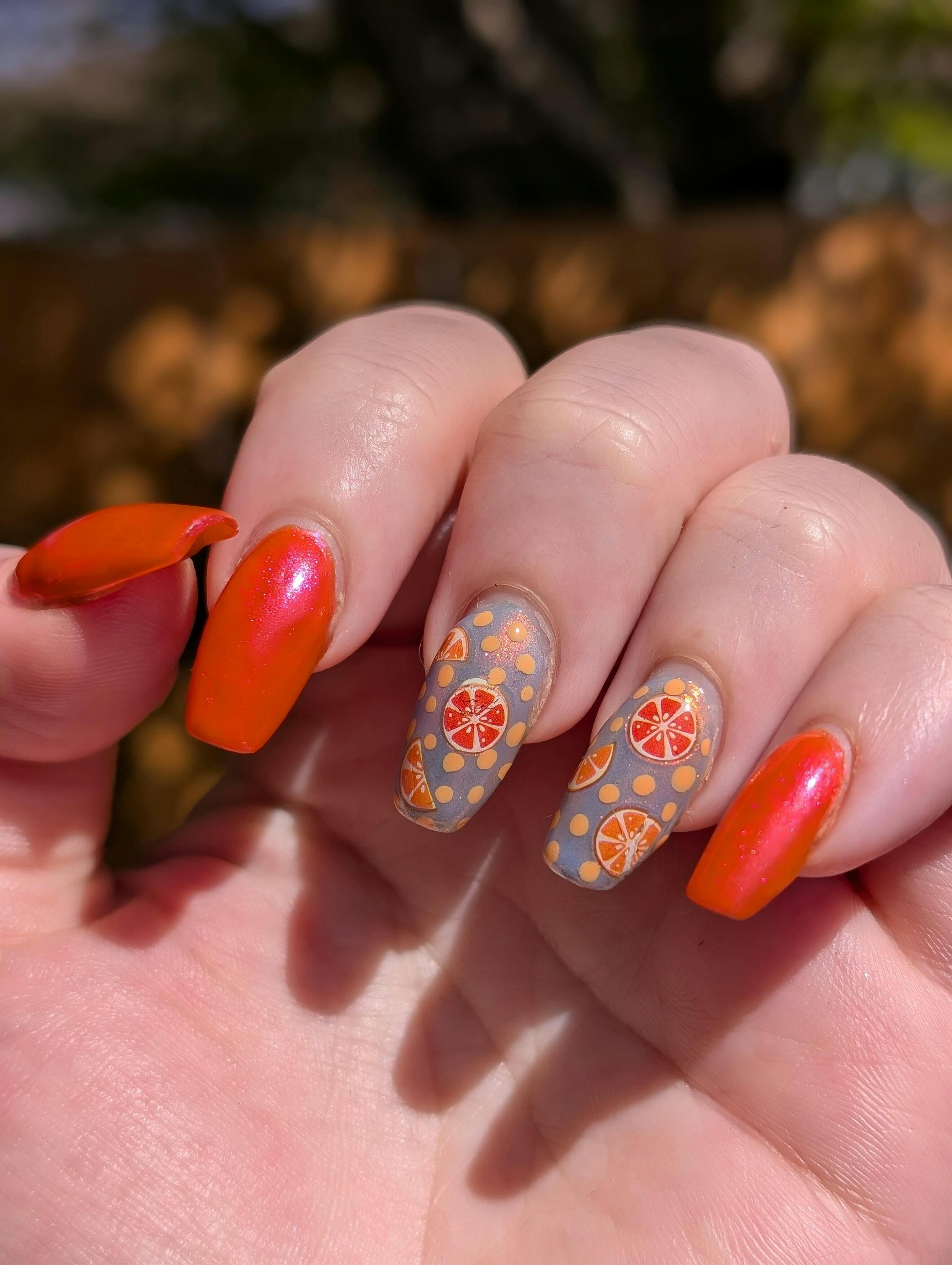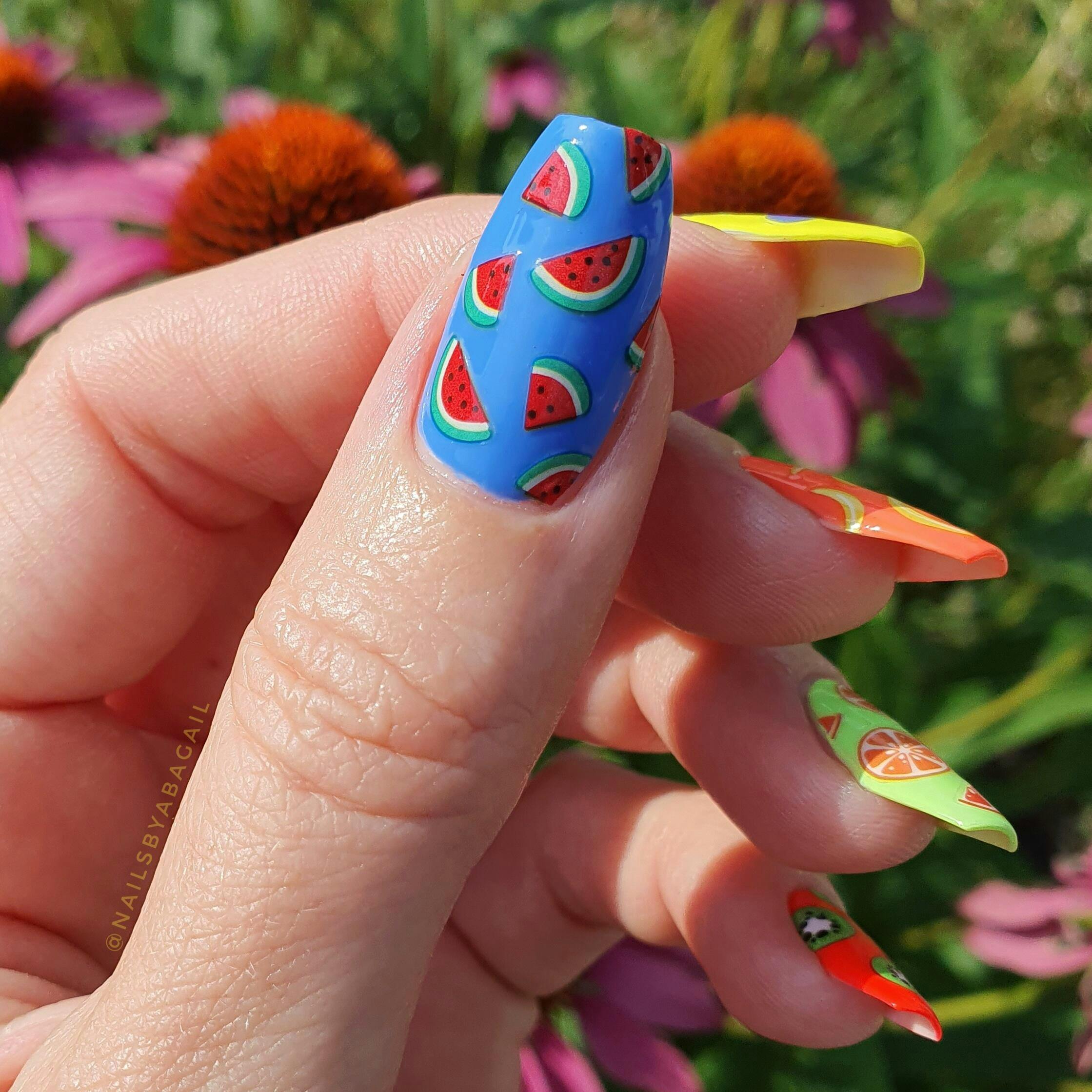 I’ve done a mixed fruit set and a watermelon set so far, and they’re some of my favorites! I usually just do the stickers on a bare nail with a clear topcoat.
