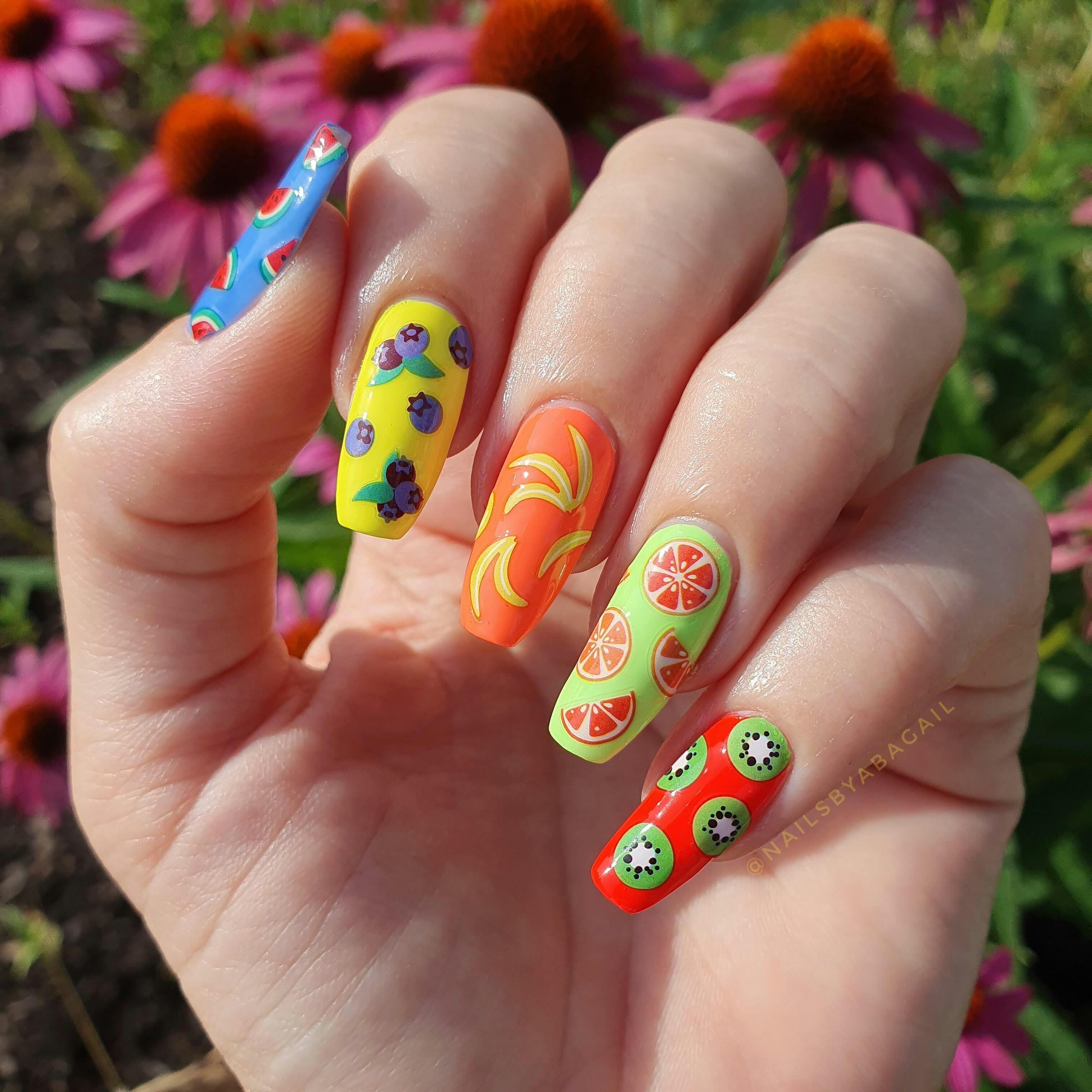 I love this fruity sticker sheet! The summer-y colors are really lovely. I like pairing these designs with bright neons. I did find that these stickers are delicate, as other reviewers did, but I am extra careful with all the stickers (using tweezers, grasping them at the largest part of the sticker, placing gently, and not moving). HOT TIP: For the bananas, make sure you layer the single and double banana stickers to get the most amazing-looking banana bunch!