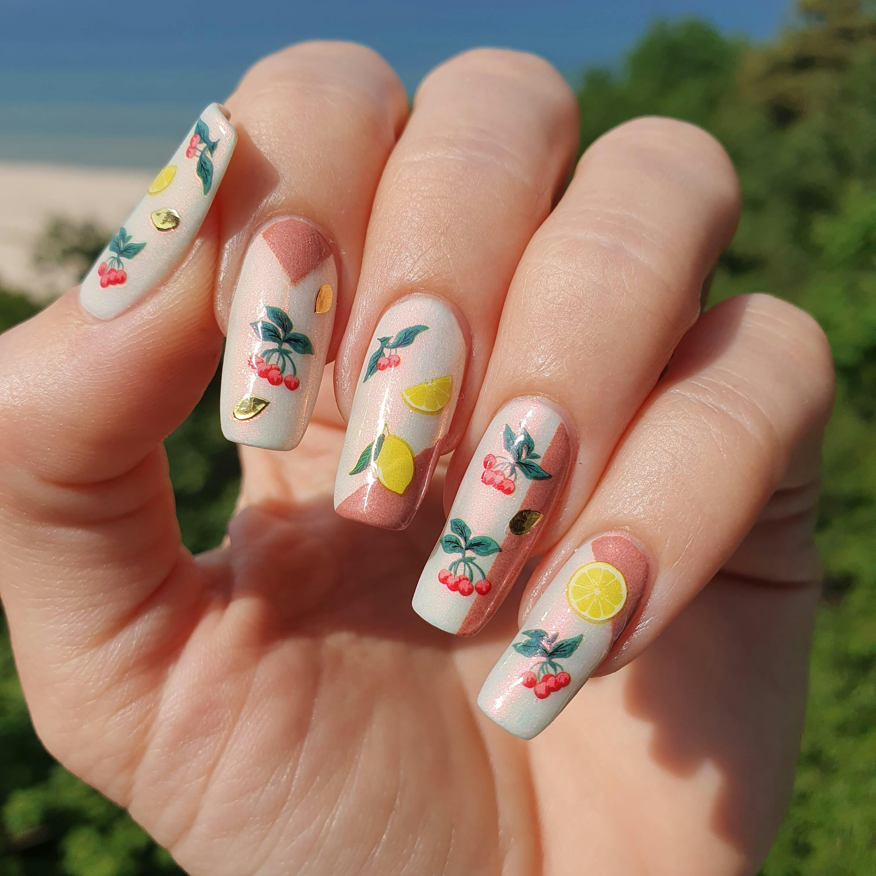 I really love how quickly you can get a super cute mani with these stickers. Theyโre some seriously good quality, too. Iโve had issues with other sticker brands just not adhering well or reacting strangely to gel topcoats, and I didnโt have any of that with these! Canโt wait to use more!! (Lemons from the Pink Pony sheet)