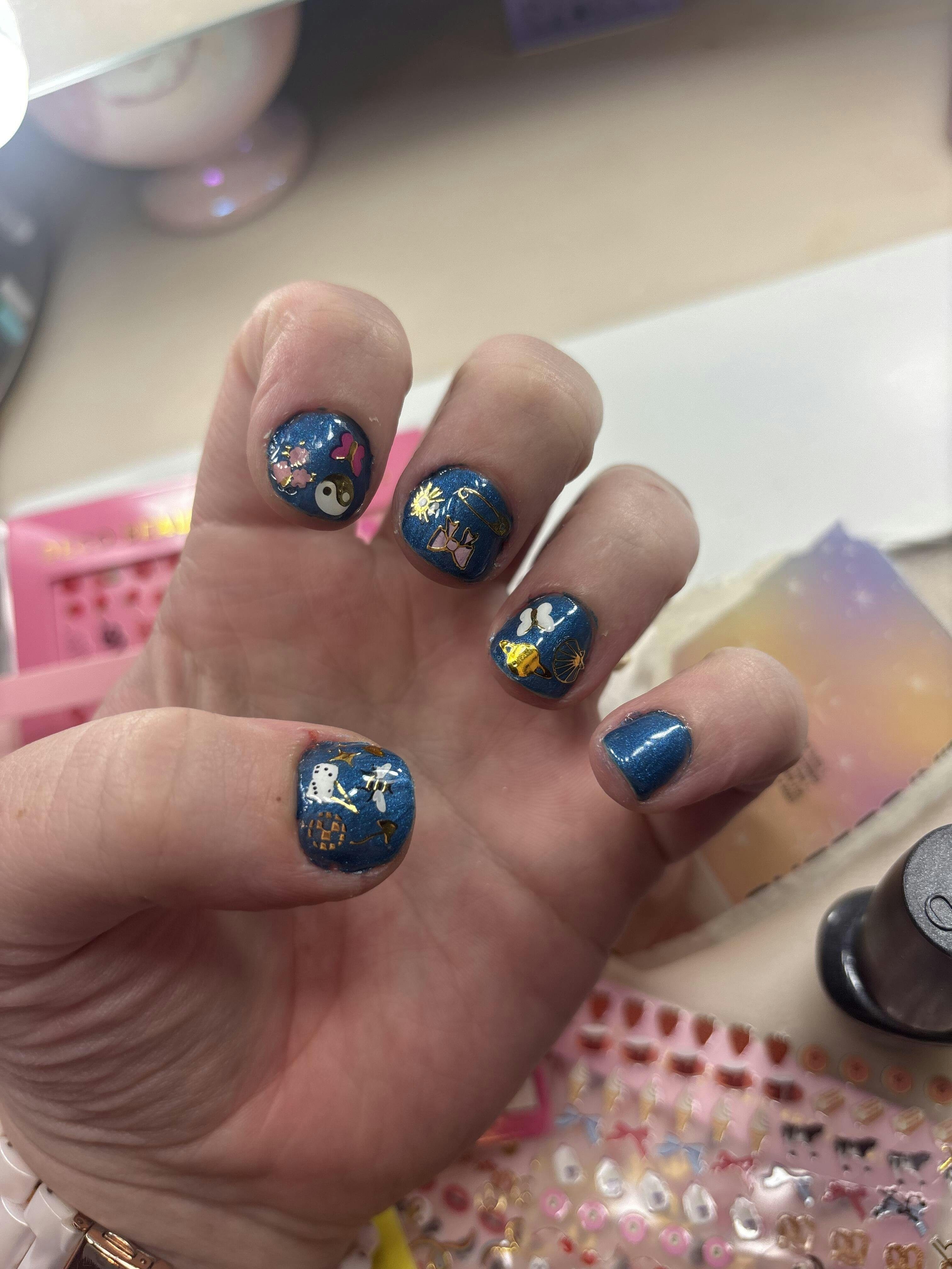 I used the gold stickers from this set on top of a more neutral semi-cured gel set from Jelcie to dress them up! Love them so much! Very easy to use once I got the hang of it. Can't wait to use more โจ